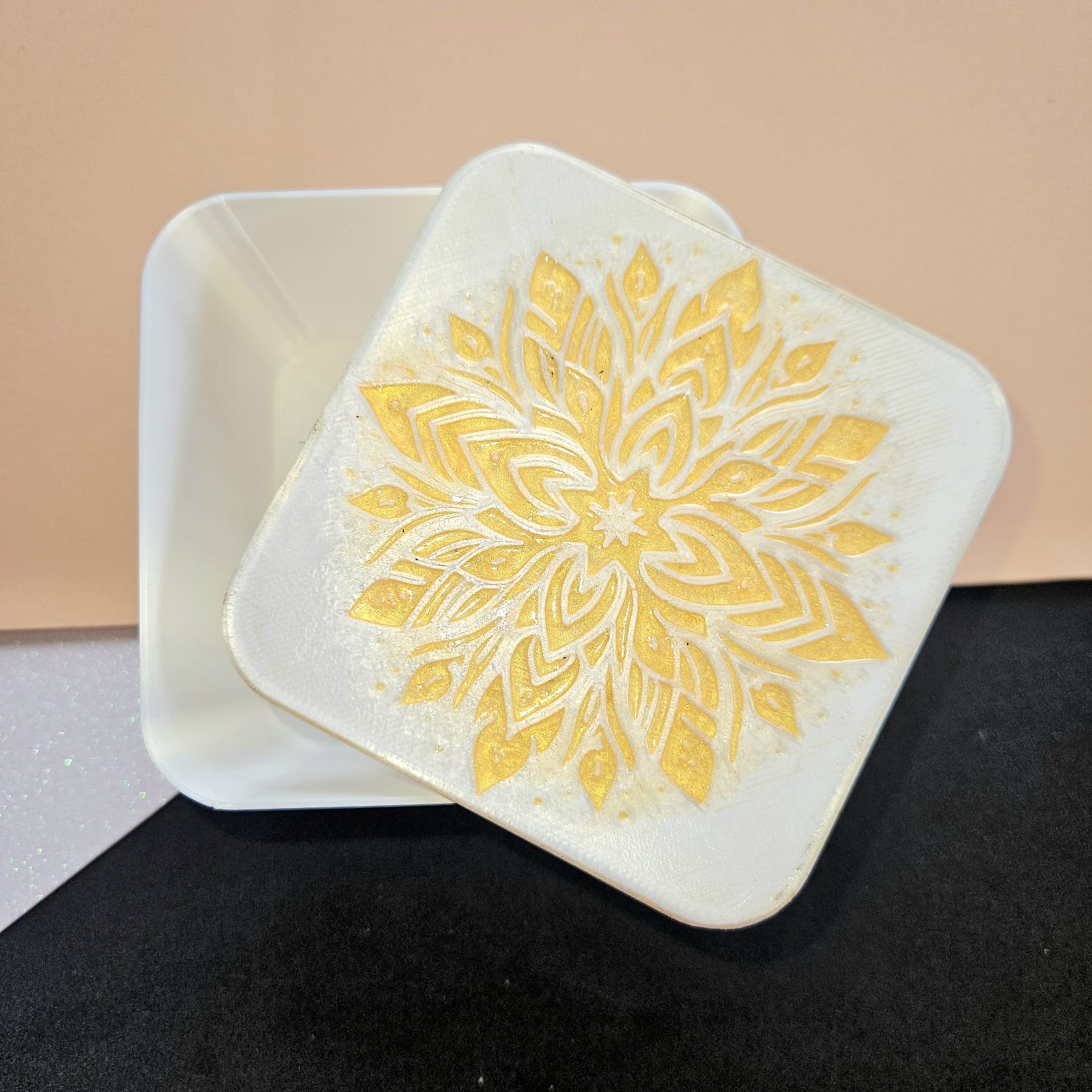 A tampa é adornada com uma mandala floral em resina dourada, simbolizando o desabrochar da consciência e a pureza da intenção. É um lembrete visual da luz que você está ancorando em cada pedido.