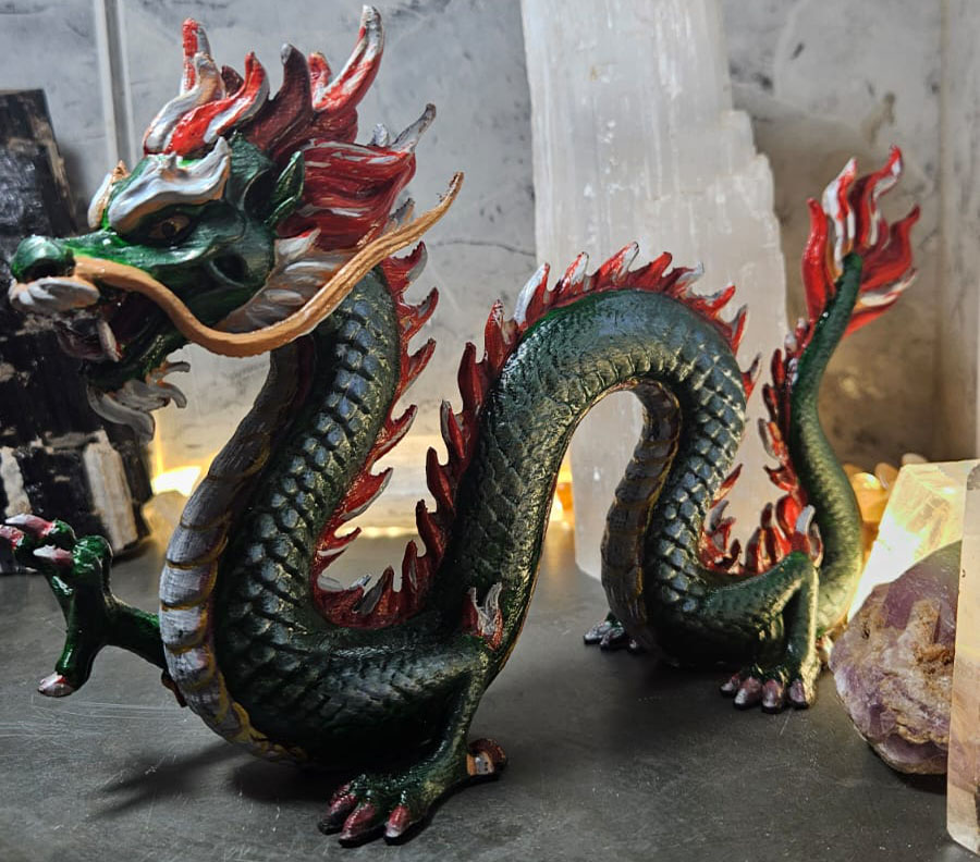 Escultura de dragão confeccionada em impressão 3D de alta definição e pintada manualmente, peça por peça, com acabamento artístico e detalhes minuciosos. O dragão representa proteção, prosperidade, força espiritual e sabedoria ancestral, sendo tradicionalmente associado à guarda de tesouros, cristais e espaços sagrados.