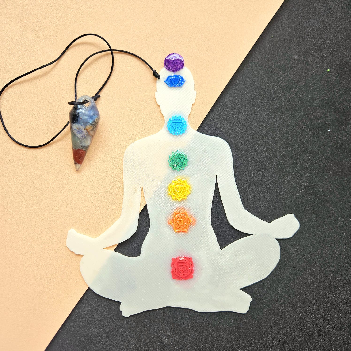 Placa em PLA resistente e pêndulo em resina com cristais genuínos no pêndulo para garantir a pureza da vibração.